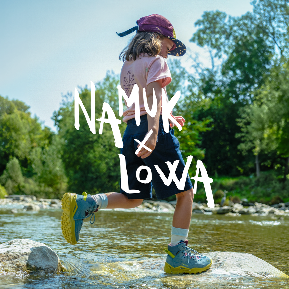 Because even the most amazing hike is no fun if feet are wet or shoes hurt, we teamed up with Lowa and developed the best kids’ hiking shoes. Our shoes for kids are light and flexible and also provide good grip, so little hikers stay steady even on rocky and uneven ground. Want to bet that your kids won’t only wear these shoes when hiking?For very cold days, there are the namuk winter shoes for kids. The namuk edition Lowa Couloir GTX Junior and Lowa Maddox GTX Junior keep snow and cold out and keep pleasant warmth in. Bring on the next hike in the snow!